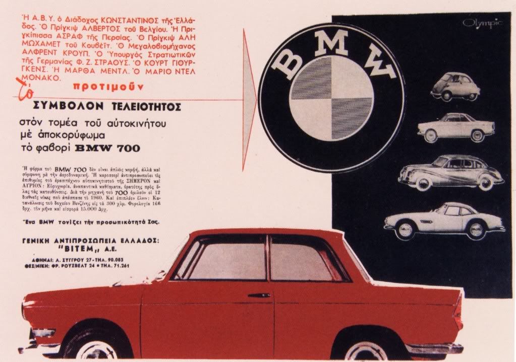 Διαφήμιση της BMW 700 με απεικόνιση της υπόλοιπης γκάμας. Απουσιάζει η 1500/1800, οπότε είναι λίγο πρίν το 60 ή στις πολύ αρχές του. Έμφαση στο διάσημο πελατολόγιο της εταιρίας τότε.