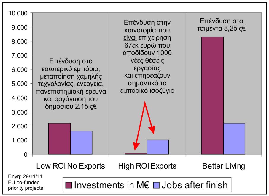 Το ιλιγγιώδες ποσό των 8,2δις πάει σε «τσιμέντα»… δηλαδή το 78,8%… πάει σε δρόμους, γεφύρια, νοσοκομεία, σχολεία, αεροδρόμια, λιμάνια… και ναι μεν δίνουν άμεσα δουλειά σε πάνω από 100.000 ανθρώπους αλλά σε ένα με δυο χρόνια οι δουλειές τέλος… μένουν μόνο 2193 μόνιμες θέσεις εργασίας…